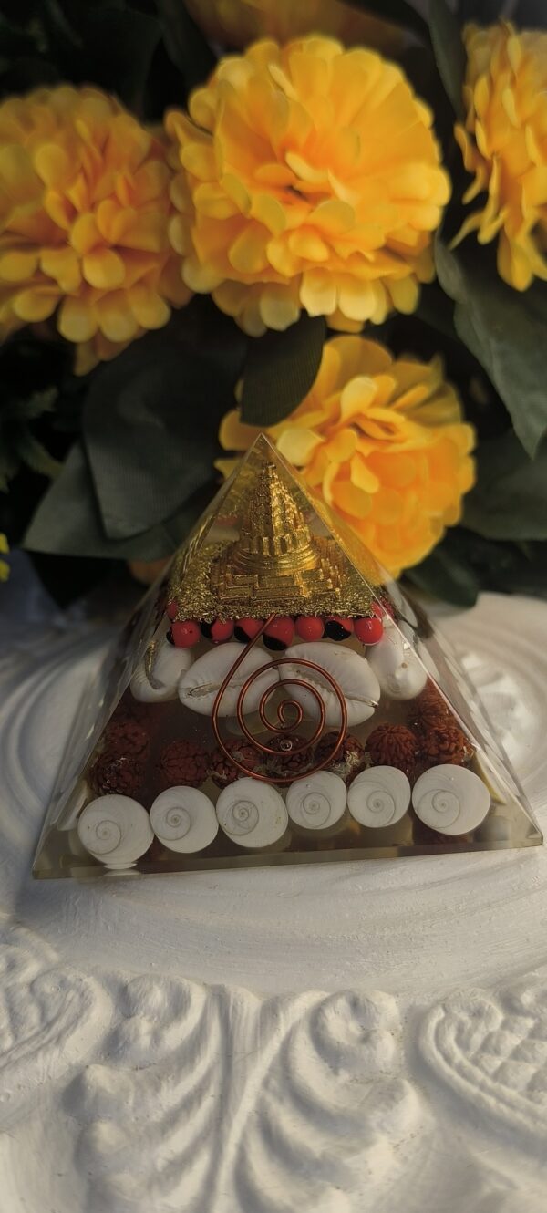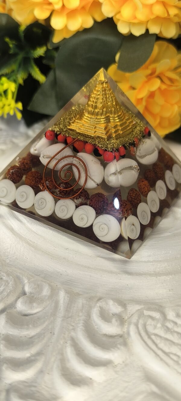 The Maha Laxmi Pyramid is a sacred fusion of powerful spiritual elements, designed to attract wealth, divine blessings, and energy protection. Infused with the presence of Shri Yantra, Gomti Chakra, Cowrie Shells, Rudraksha, and Chirmi beads, this pyramid becomes a potent Vastu tool that harmonizes the environment and connects you with Goddess Laxmi’s abundant energy.