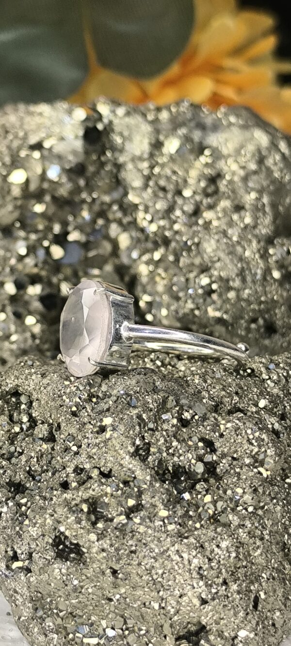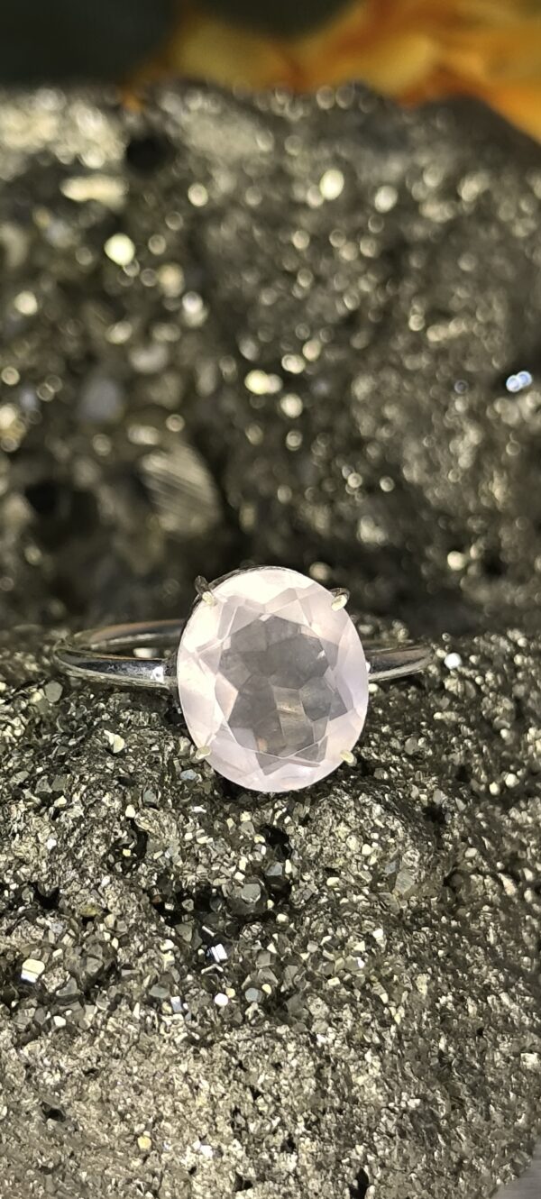 This beautiful ring features a diamond-cut Rose Quartz—the stone of universal love. Its gentle pink hue is enhanced by the sparkling facets, symbolizing emotional warmth and elegance. Rose Quartz is known for attracting love, fostering self-worth, and healing emotional wounds. The diamond cut adds brilliance and enhances the stone’s natural calming energy.